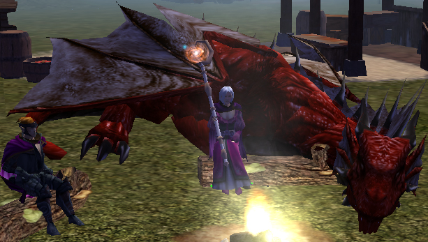 My Cleric of Lastai, Liera- in purple with the staff- sitting 'round a fire with her friends. Yes, including the dragon.